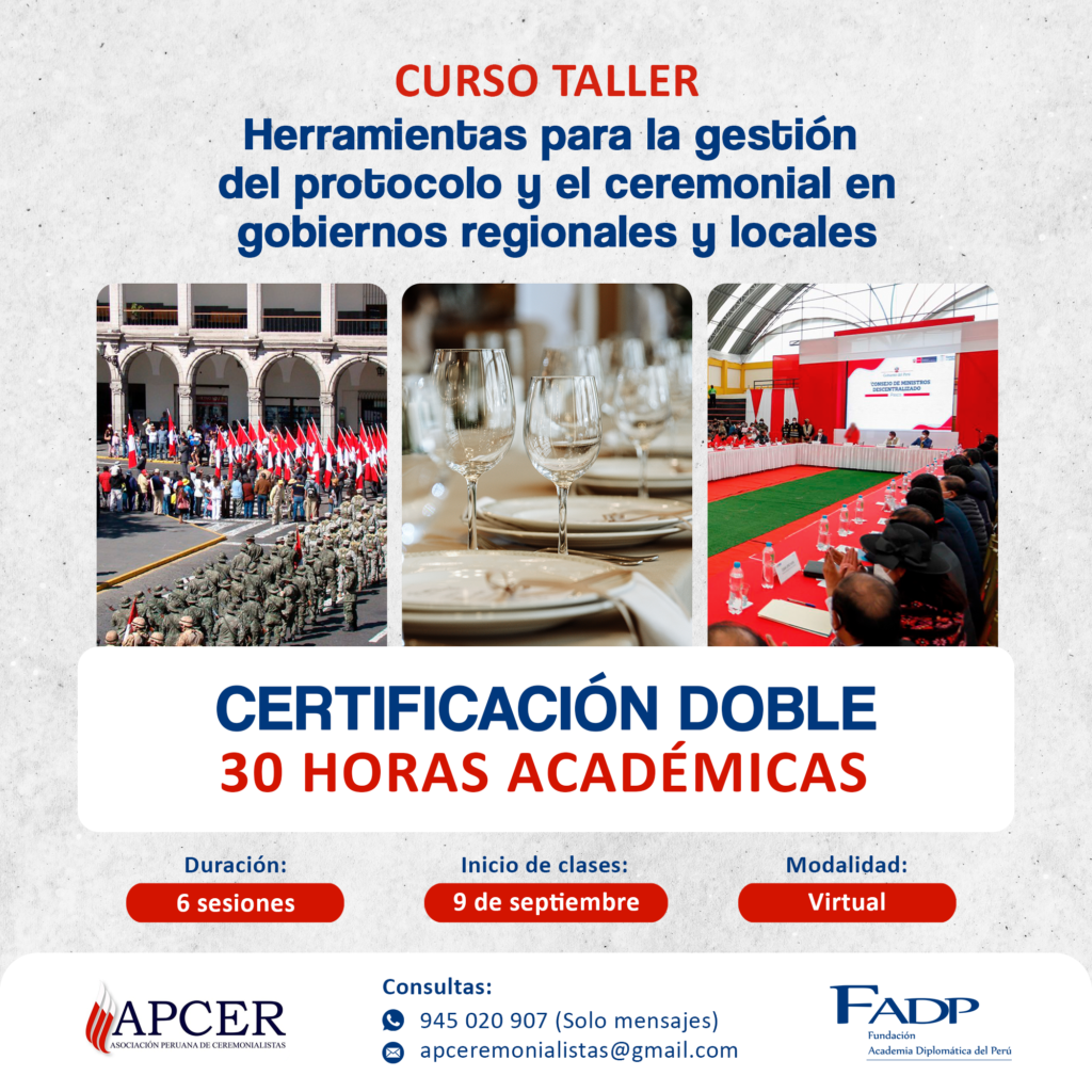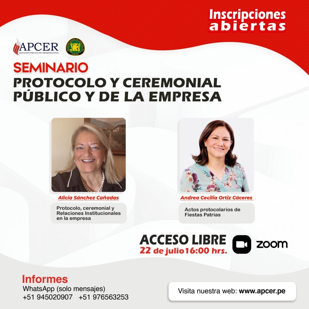 CURSO APCER Protocolo, ceremonial y eventos Jueves 8 y viernes 9 de mayo 7:00 pm – 9:30 pm Sábado 10 de mayo 9:30 am – 12:00 pm Participación libre previa inscripción en el siguiente formulario Ingreso al curso con lista Jueves – Ministro Consejero Enrique Noria Freyre – vicepresidente APCER Ceremonial y protocolo de […]
