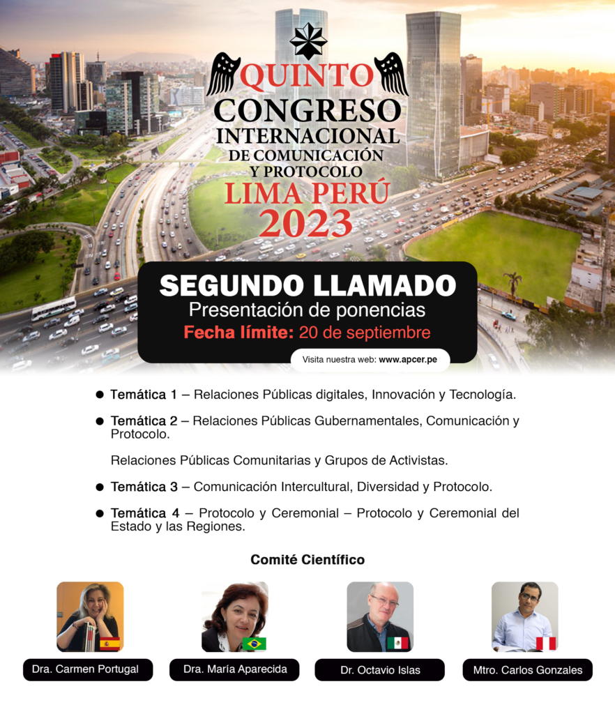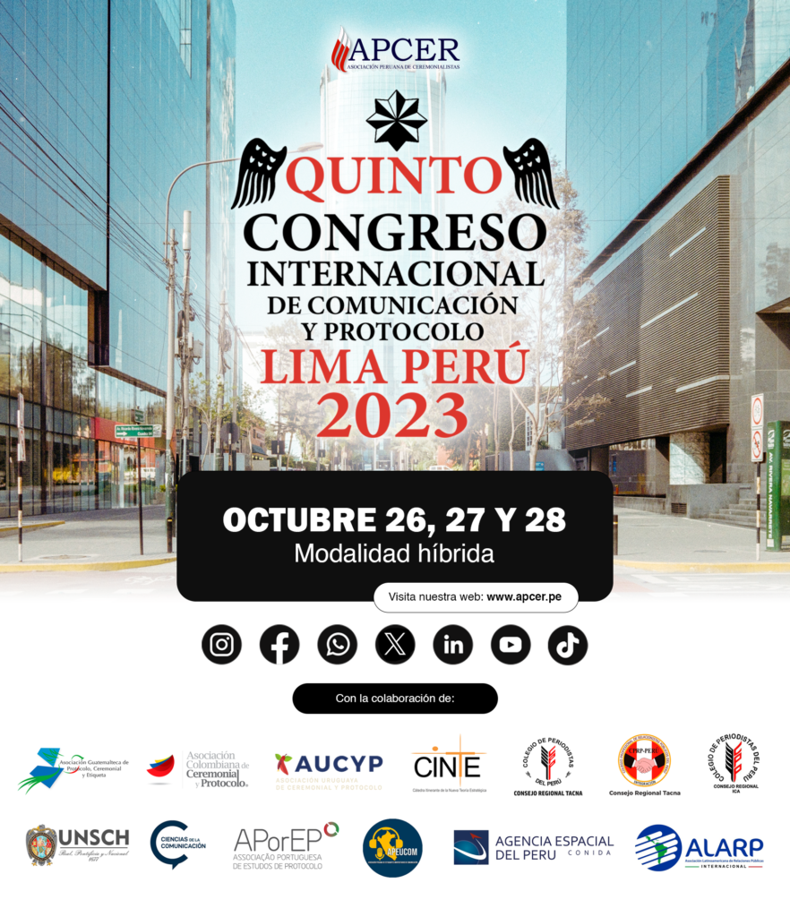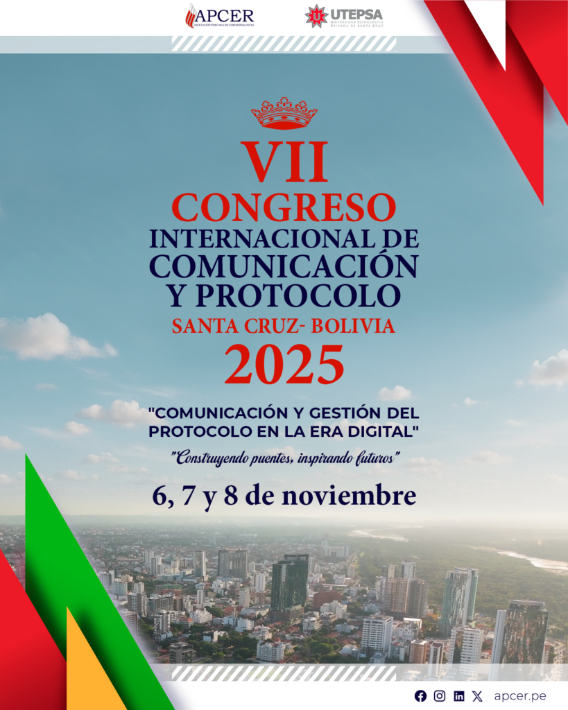 VII Congreso Internacional de Comunicación y Protocolo «Comunicación y Gestión del Protocolo en la Era Digital» Presentación El Séptimo Congreso Internacional de Comunicación y Protocolo (VII CICYP), organizado por la Asociación Peruana de Ceremonialistas (APCER) en colaboración con la Universidad Tecnológica Privada de Santa Cruz (UTEPSA), se celebrará los días 6, 7 y […]